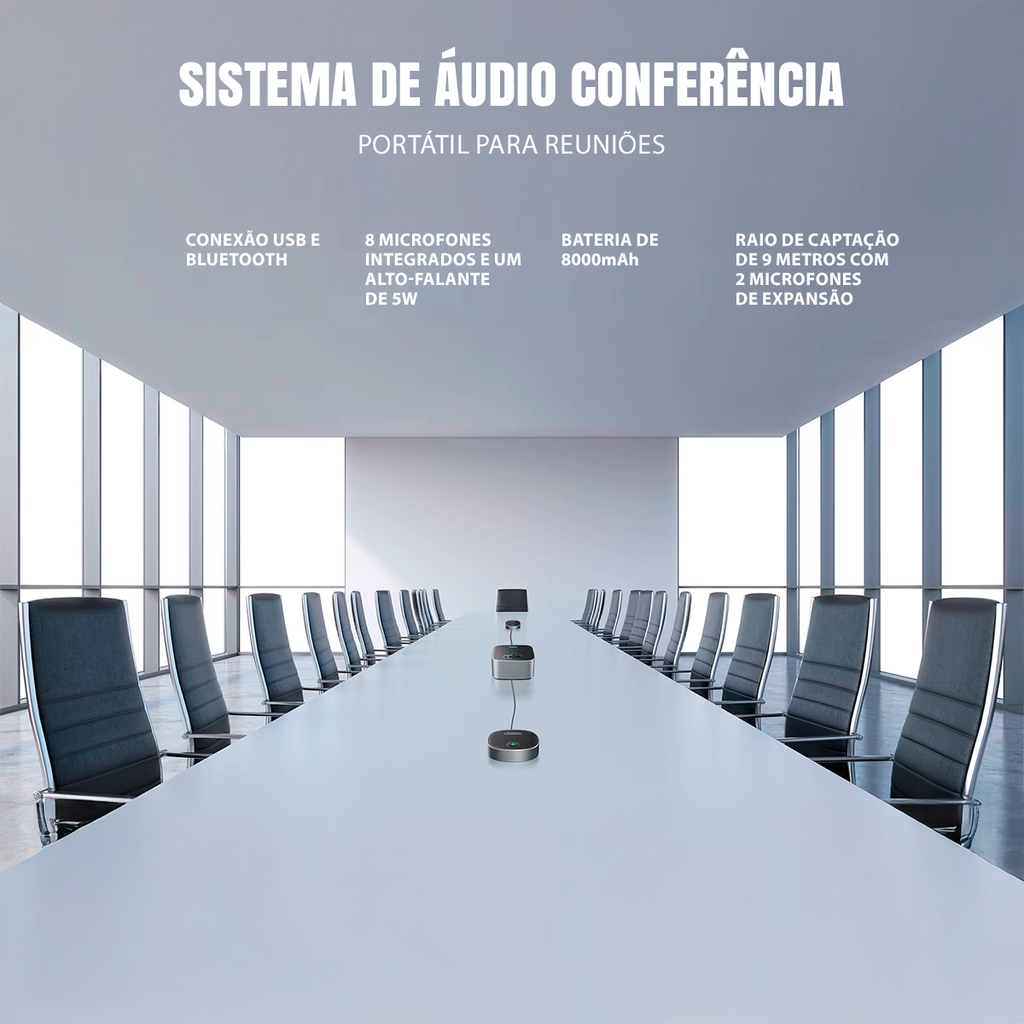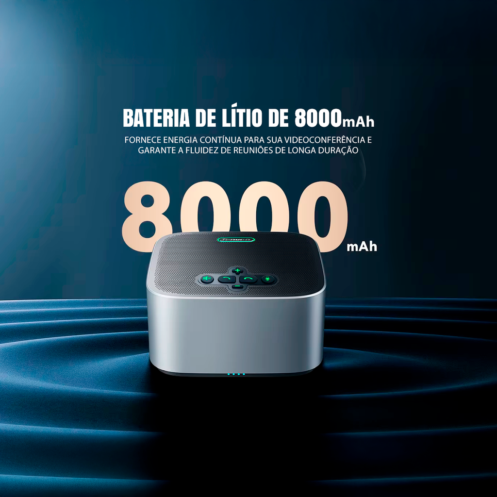 Com conexão USB-C, modo sem fio e portas 3.5mm, o sistema funciona com qualquer computador ou plataforma de videoconferência, além de oferecer alta autonomia com bateria interna de 8000mAh.