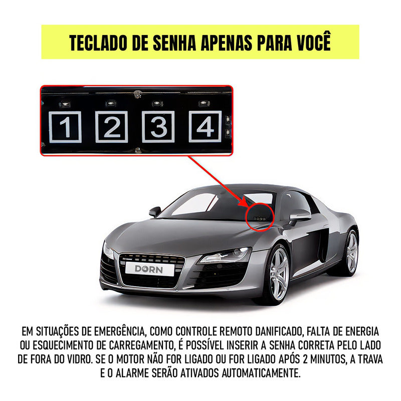 - Segurança por Senha: Teclado Numérico fixado no vidro que permite o desbloqueio e operação do veículo apenas com a digitação da senha.