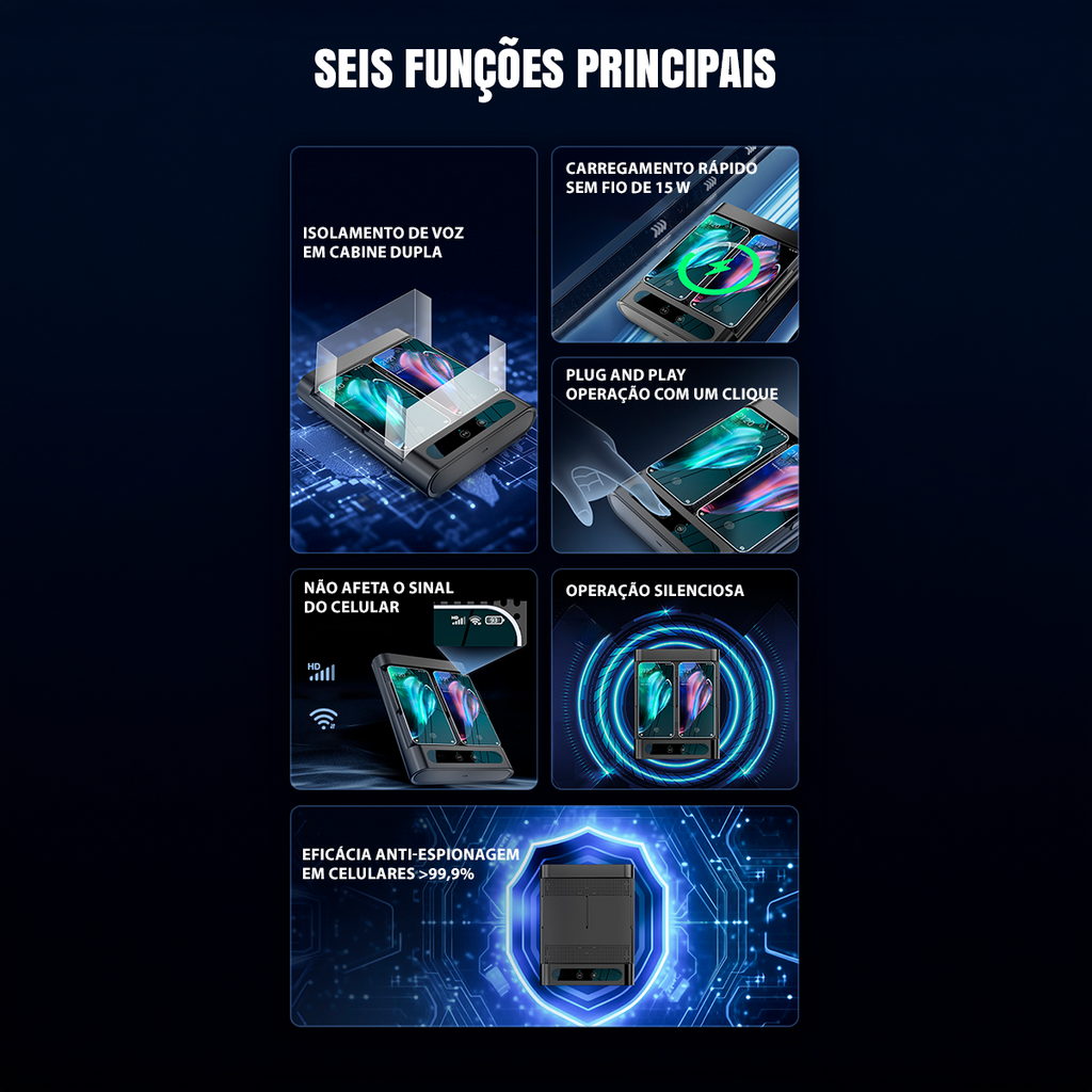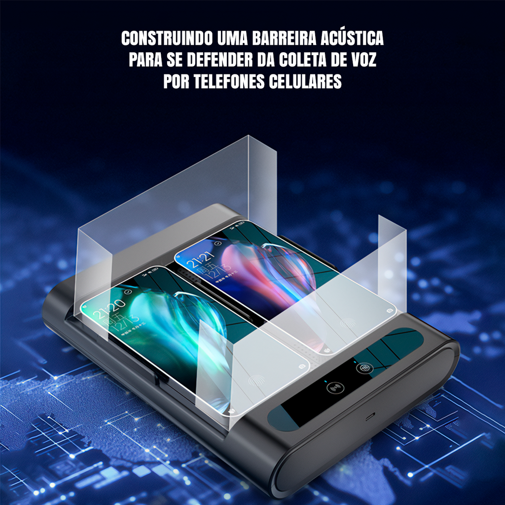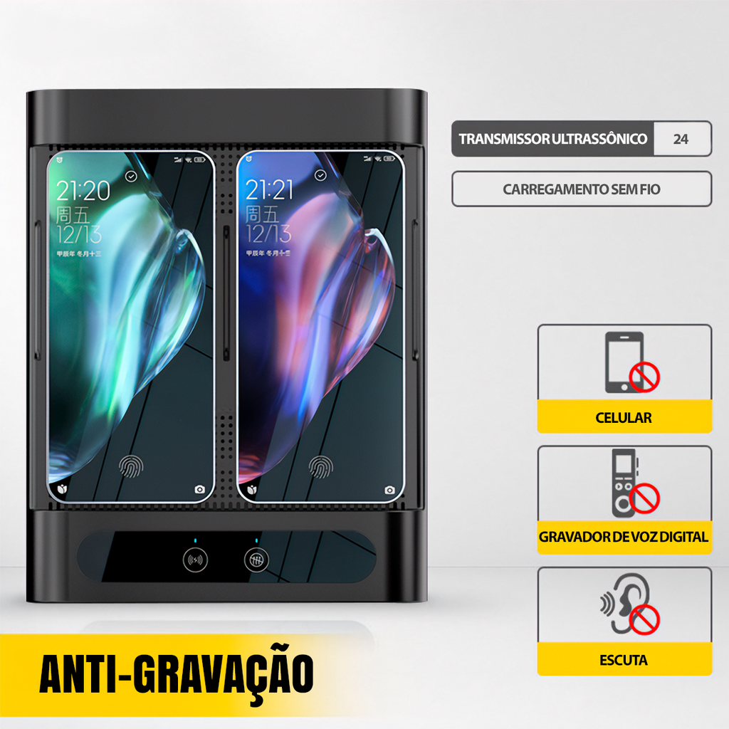Com design moderno em formato de doca, ele cria uma câmara anti-espionagem. Ao posicionar os celulares no compartimento, os microfones são bloqueados por sinais ultrassônicos inaudíveis ao ouvido humano, mas fatais para qualquer tentativa de gravação.