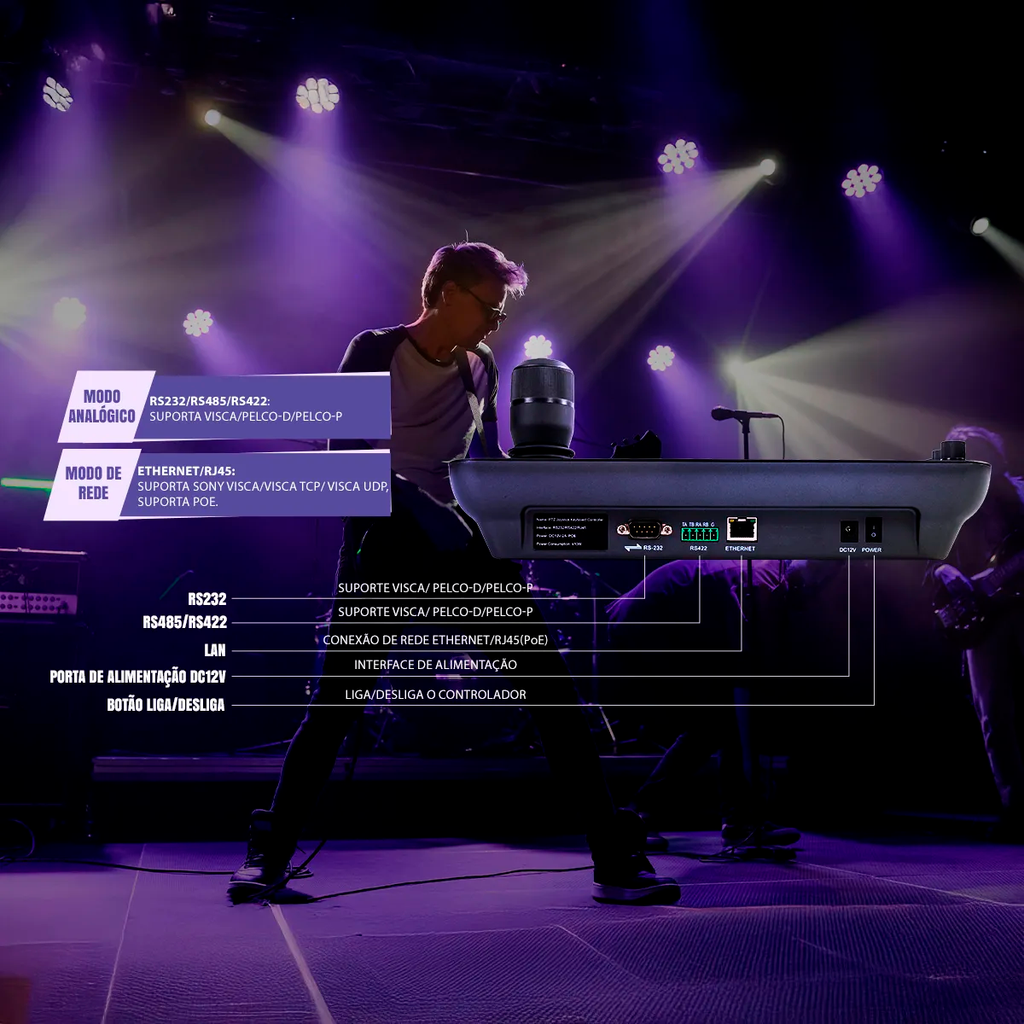 - Joystick 4D: Controle preciso de zoom, pan/tilt e velocidade do movimento.