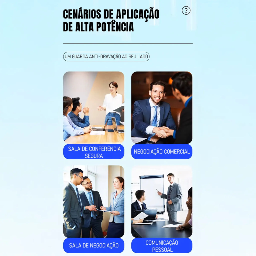 O Bloqueador Ultrassônico DORN foi desenvolvido para proteger reuniões, negociações e ambientes sensíveis contra gravações não autorizadas. Com tecnologia avançada de interferência em múltiplas frequências, garante privacidade total com cobertura de 360°.