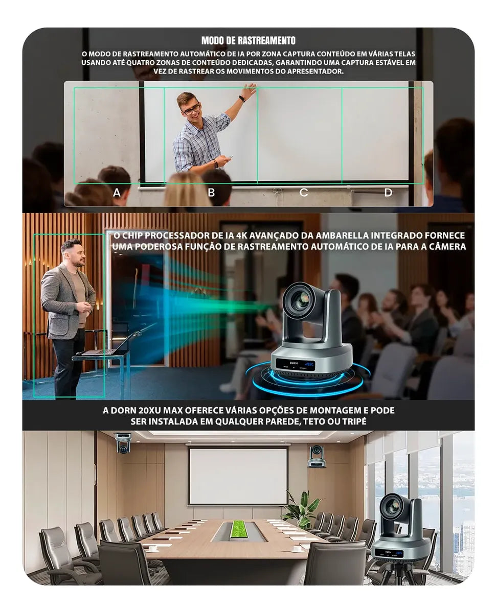 - Cinegrafista Virtual (IA Integrada): A câmera conta com algoritmos inteligentes para Auto-Tracking. Ela rastreia e segue automaticamente um palestrante (Presenter), divide o palco em Zonas (Zone Tracking) ou enquadra várias pessoas ao mesmo tempo (Auto Framing).