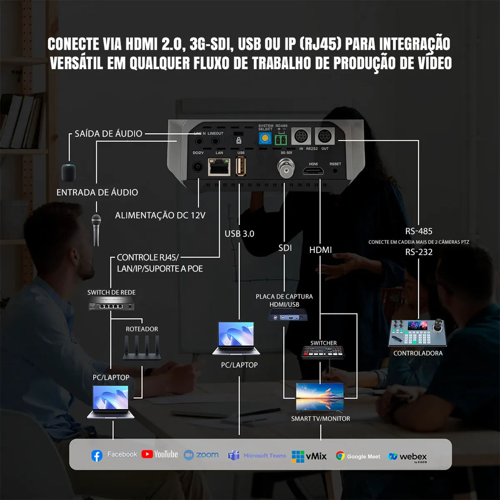 - Saídas de Vídeo: 1x HDMI, 1x 3G-SDI (BNC, 75Ω, SMPTE 424M), 1x LAN RJ45 (10M/100M/1000M Gigabit), 1x USB 2.0 (Tipo A / Protocolo UVC 1.1~1.5).