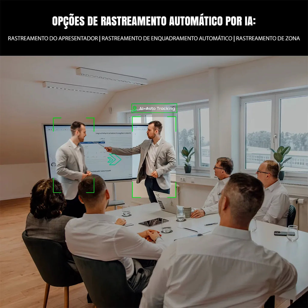 - Rastreamento IA (Auto-Tracking): 3 Modos - Presenter (segue 1 pessoa), Zone Tracking (4 zonas de palco) e Auto Framing (enquadra todos).