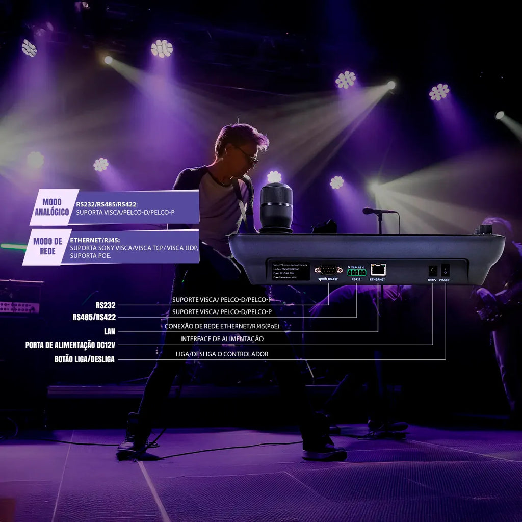 - Movimentação: Joystick 4D dinâmico para Pan, Tilt, Zoom e Foco com ajuste de velocidade.